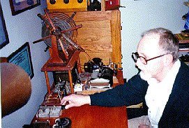 150 Bill Holly, K1BH, at the Key of his 1918 Spark Transmitter: (32KB)