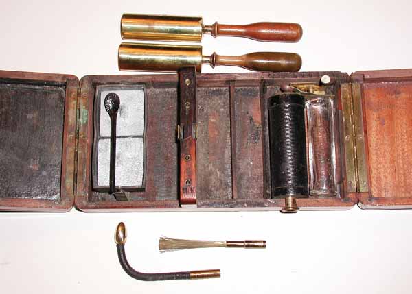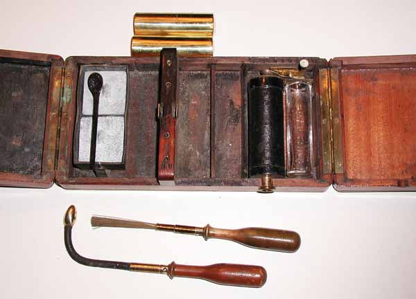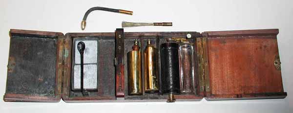 case. The set consists of an early chemical battery, a buzzer-interrupter