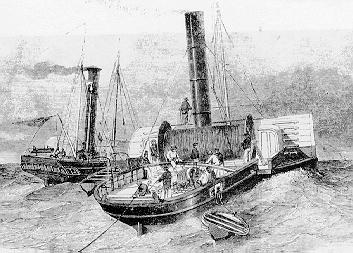 I have always been fascinated by the early transatlantic telegraph cables which linked, for the very first time, Europe and the United States beginning in 1858. Here is a picture of one of the original ships laying the cable (39KB). and here is another picture of the laying of the cable (29KB). As you can imagine, this was an absolutely incredible undertaking at the time and it allowed nearly instantaneous communication between the United States and Europe instead of the several-week delay necessitated by using ships to carry the messages.